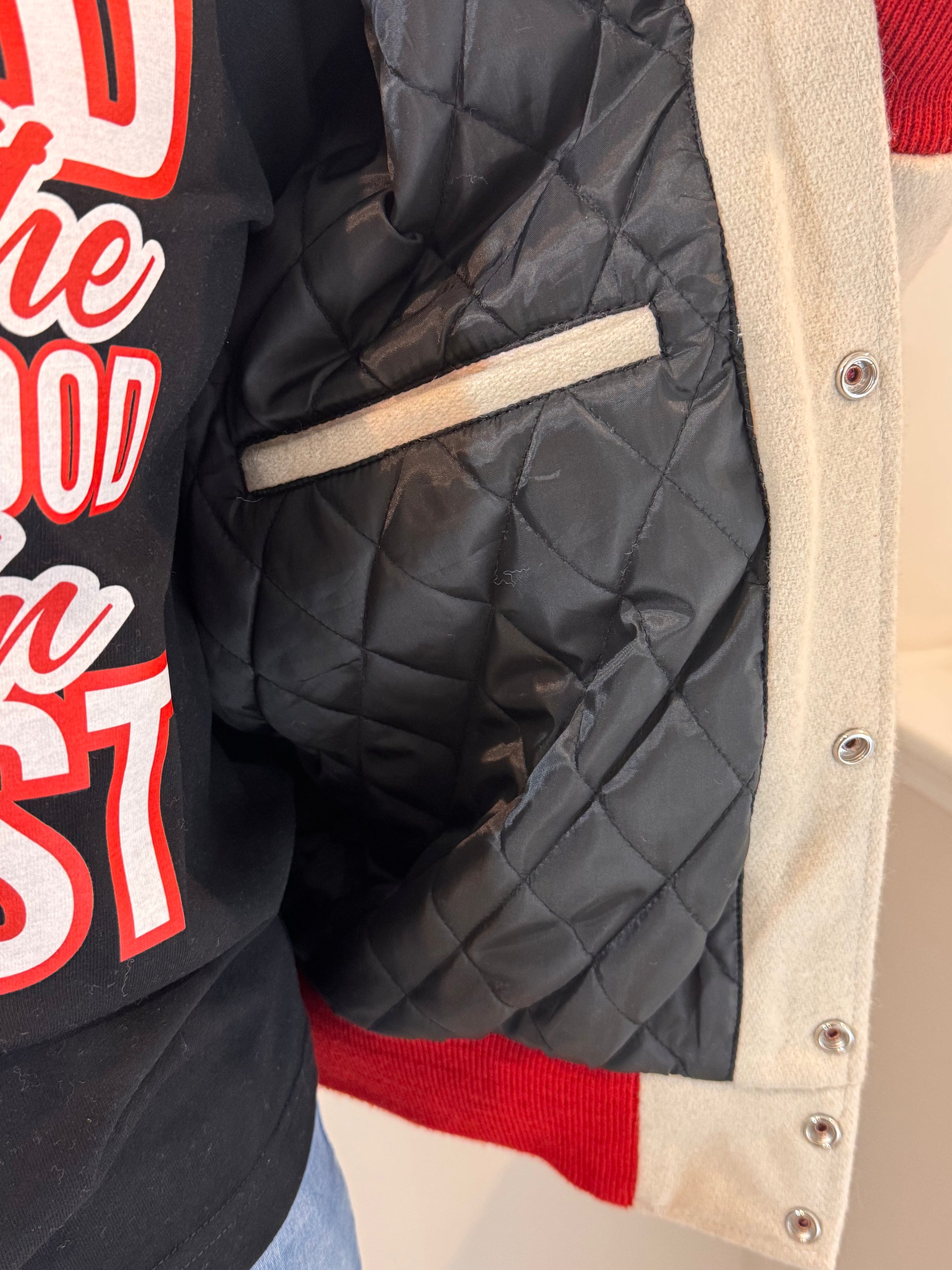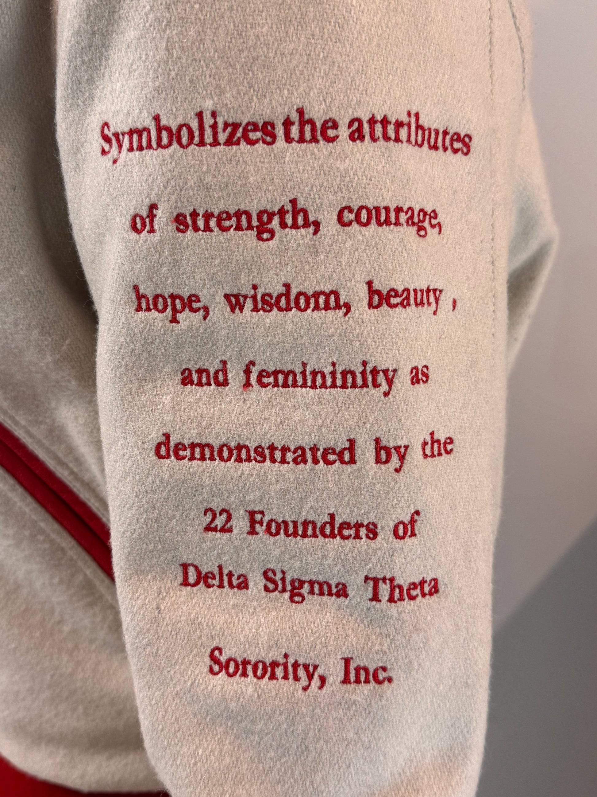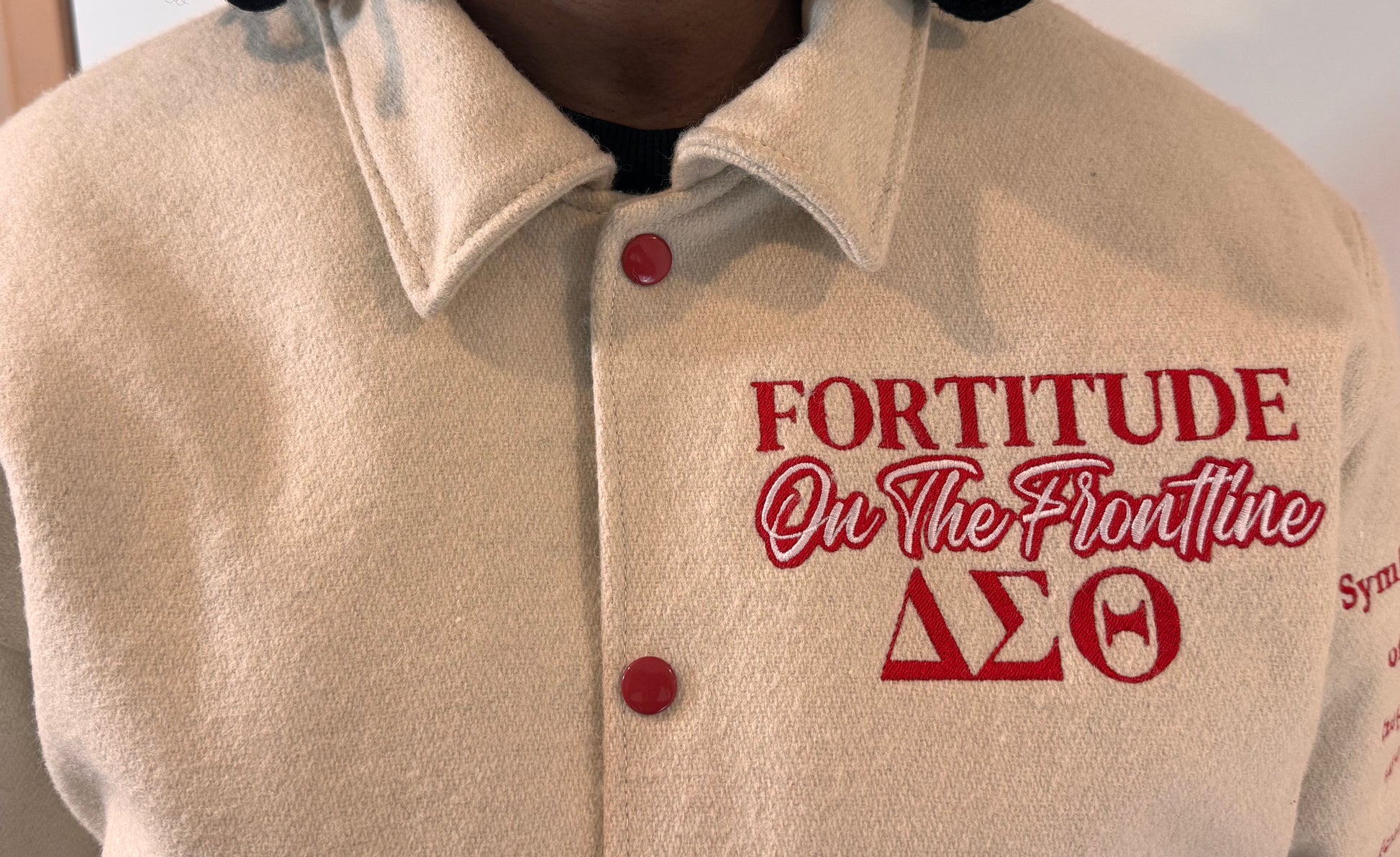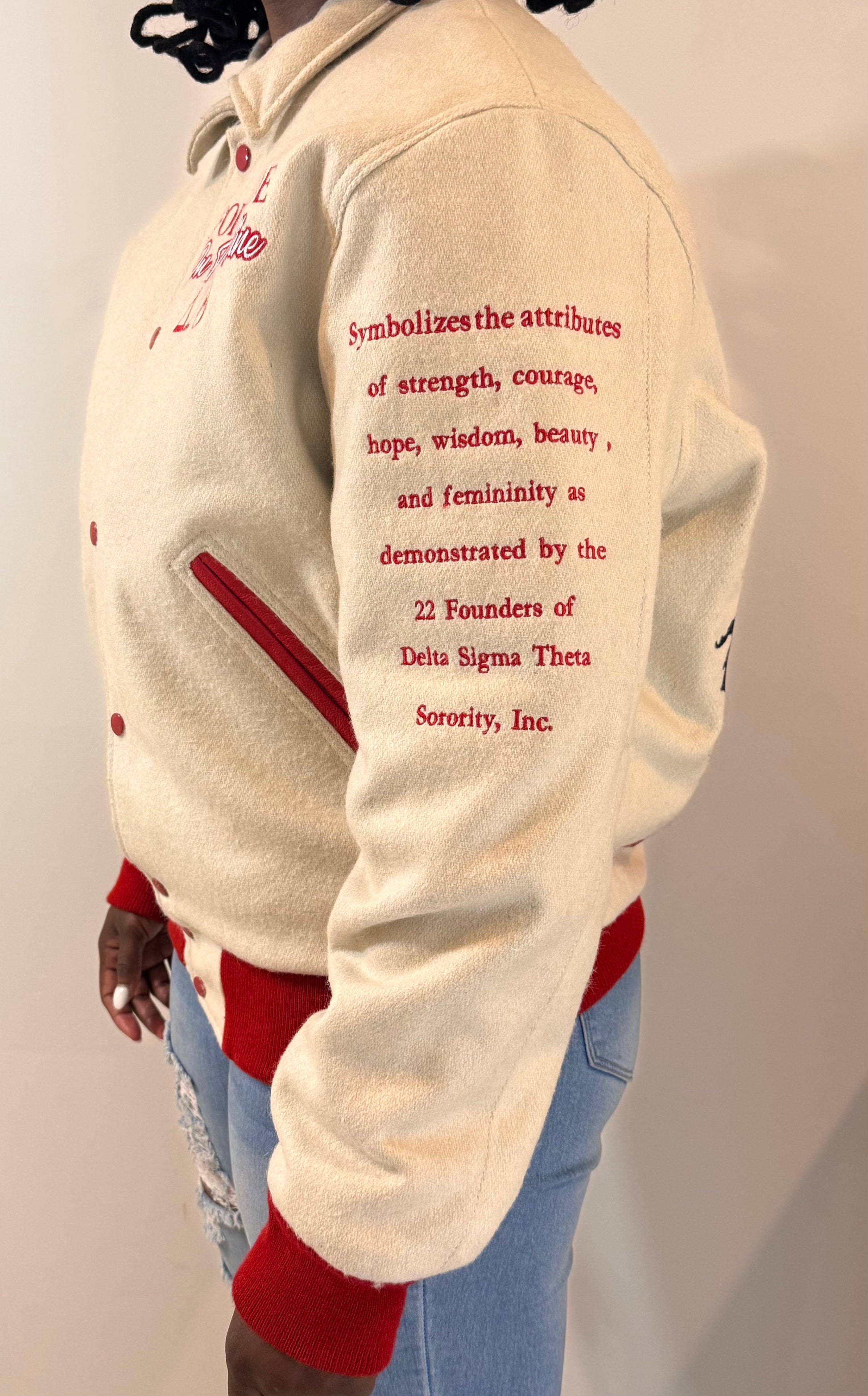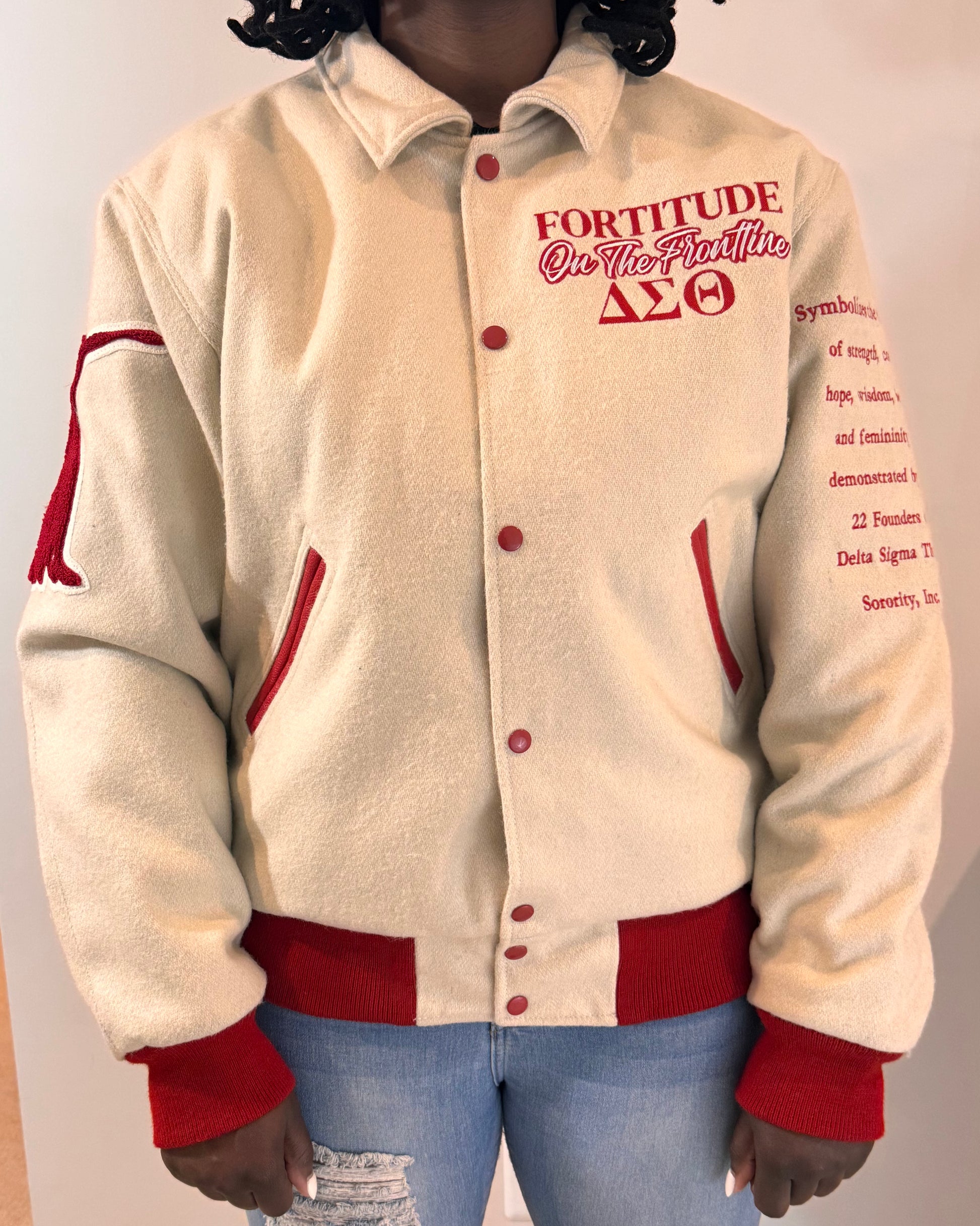 This cream wool varsity jacket embodies Fortitude on the Frontline—a bold statement piece that turns heads and tells a story. With every stitch, it honors the legacy of those who marched in 1913 during the Women’s Suffrage Movement, while championing the strength and vision of where we’re headed. More than fashion, it's wearable art—a movement, a message, and a reminder of resilience and progress.